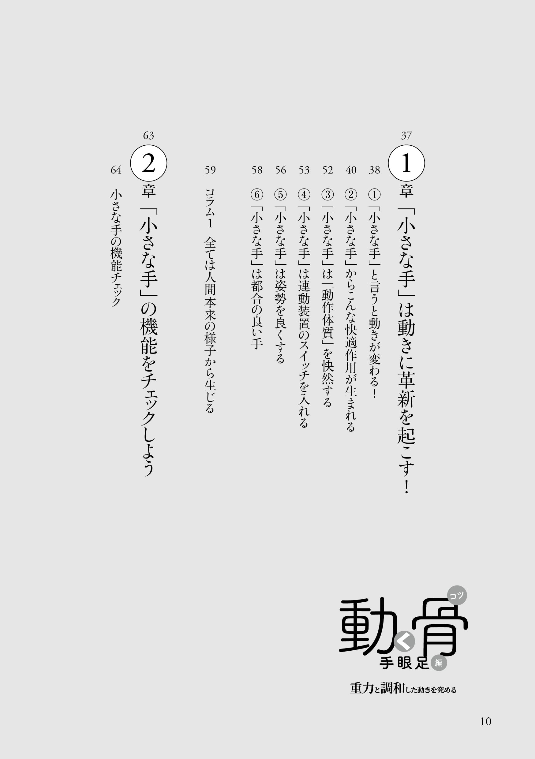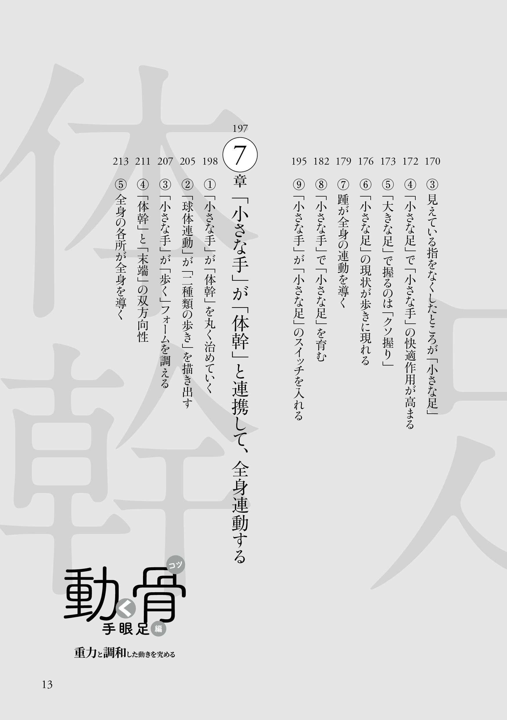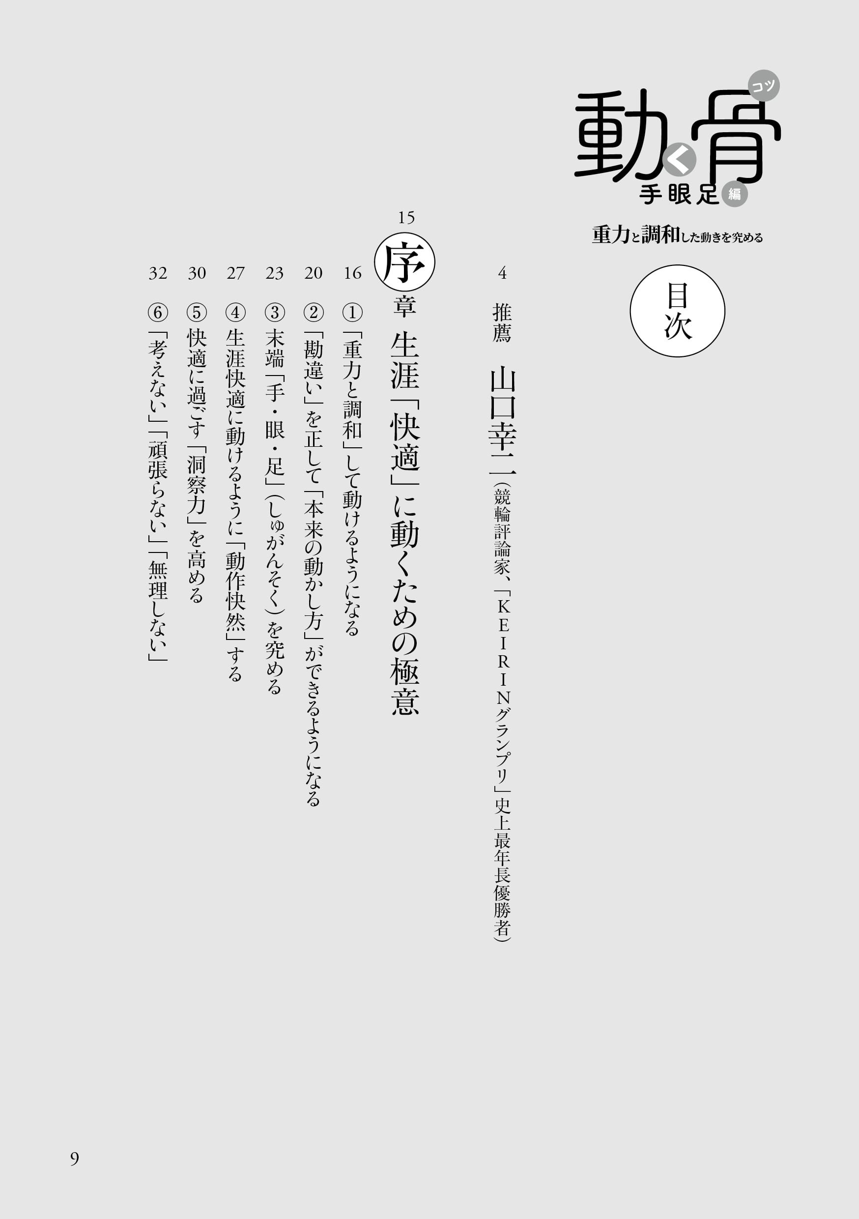著者はトヨタ自動車(株)にエンジニアとして勤めるも、持病の腰痛を自力で克服したのを機に「人体の奥深さ」に好奇心が向き、それを探究すべく1999年に同社を退社した。以後、自らが持病を克服した手法による「体調快善」の支援を始め、自然と調和した身体の動かし方の探究「道理探究」に取り組み、骨格構造に主眼を置いた独自の身体操法「体幹内操法」を2002年に創始。その基本要素を、2005年に上梓した『動く骨(コツ)』(現在、オンデマンド版を剣道日本より刊行)にまとめあげた。それから14年後の2016年、(株)ベースボール・マガジン社より『動く骨 手眼足編』が刊行されるも、その後、絶版。待望の復刻版が10年ぶりに刊行された。それが本書である。(全248ページ)